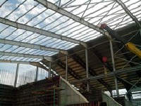 Для кровли было поставлено 7500 кв. м сэндвич-профиля, 400 упаковок теплоизоляции, 40 рулонов ветрозащитной гидроизоляционной мембраны. Для стен – 2500 кв. м сэндвич-профиля и 1335 элементов подконструкции. Внешняя облицовка стен и крыши выполнена из профилированного листа заказчика.